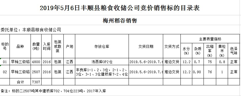 受客戶委托,梅州市嘉應(yīng)糧食交易中心有限公司定于2019年5月6日(星期一)舉辦糧食競(jìng)價(jià)交易會(huì),豐順縣糧食收儲(chǔ)公司擬銷售2016年早秈稻7084噸2017年早秈稻223噸。