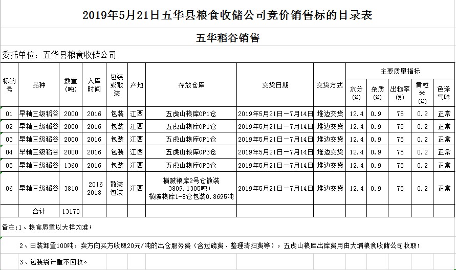 受客戶委托,梅州市嘉應(yīng)糧食交易中心有限公司定于2019年5月21日(星期二)舉辦糧食競價(jià)交易會(huì),廣東省五華縣糧食收儲(chǔ)公司擬銷售2016年早秈稻13169.1305噸,2018年早秈稻0.8695噸。