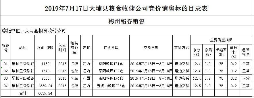 受客戶委托,梅州市嘉應糧食交易中心有限公司定于2019年7月17日(星期三)舉辦糧食競價交易會,大埔縣糧食收儲公司擬銷售2016年早秈稻6639.24噸。