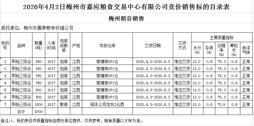 交易時間和地點:2020年4月2日(星期二)上午10時15分。廣東省梅州市彬芳大道南161號梅州市糧食交易中心3樓。
