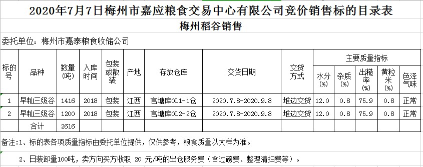 受客戶委托,梅州市嘉應(yīng)糧食交易中心有限公司定于2020年7月7日(星期二)舉辦糧食競(jìng)價(jià)交易會(huì),梅州市嘉泰糧食收儲(chǔ)公司擬銷(xiāo)售2018年早秈稻2616噸。