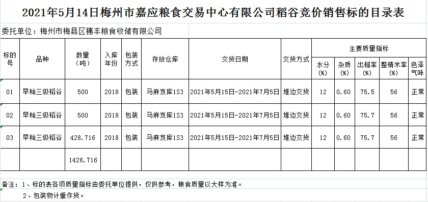 受客戶(hù)委托,梅州市嘉應(yīng)糧食交易中心有限公司定于2021年5月14日(星期五)舉辦糧食競(jìng)價(jià)交易會(huì)。梅州市梅縣區(qū)穗豐糧食收儲(chǔ)有限公司擬銷(xiāo)售2018年早秈稻1428.716噸。