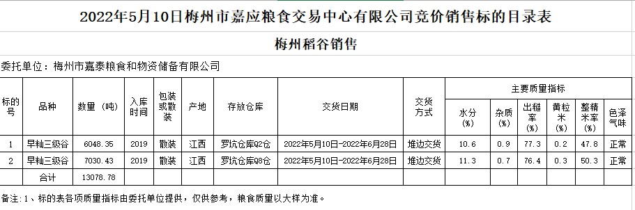 受客戶委托,梅州市嘉應(yīng)糧食交易中心有限公司定于2022年5月10日(星期二)舉辦糧食競價(jià)交易會(huì)。梅州市嘉泰糧食和物資儲(chǔ)備有限公司擬銷售2019年早秈稻13078.78噸。