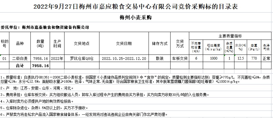 受客戶委托,梅州市嘉應(yīng)糧食交易中心有限公司定于2022年9月27日(星期二)舉辦糧食競(jìng)價(jià)交易會(huì)。梅州市嘉泰糧食和物資儲(chǔ)備有限公司擬采購(gòu)2022年二級(jí)白麥7958.16噸。