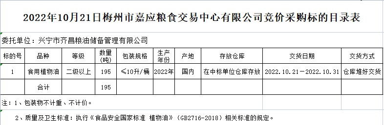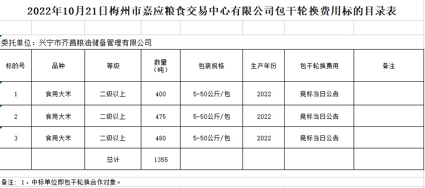 受客戶委托,梅州市嘉應(yīng)糧食交易中心有限公司定于2022年10月21日(星期五)上午10時(shí)在廣東省梅州市彬芳大道南161號梅州市糧食交易中心3樓,舉辦興寧市本級成品糧油動(dòng)態(tài)儲(chǔ)備競價(jià)采購及包干輪換費(fèi)用公開招標(biāo)。