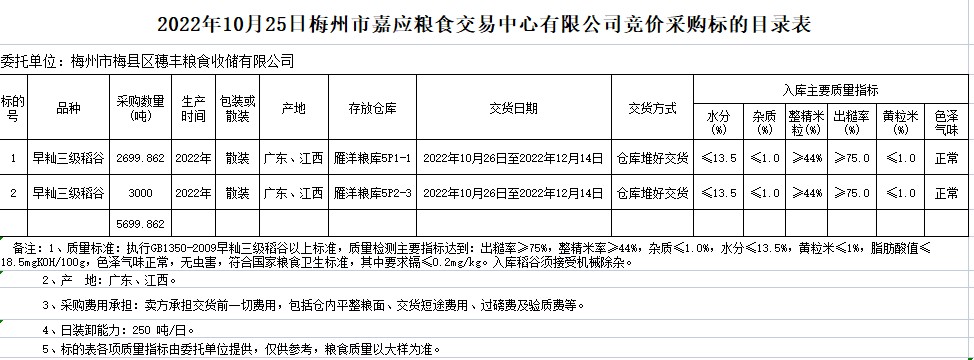 受客戶委托,梅州市嘉應(yīng)糧食交易中心有限公司定于2022年10月25日(星期二)舉辦糧食競(jìng)價(jià)交易會(huì)。梅州市梅縣區(qū)穗豐糧食收儲(chǔ)有限公司擬采購(gòu)2022年早秈稻5699.862噸。