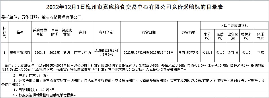 受客戶委托,梅州市嘉應糧食交易中心有限公司定于2022年12月1日(星期四)舉辦糧食競價交易會。五華縣琴江糧油收儲管理有限公司擬采購2022年早秈稻3203.3噸。
