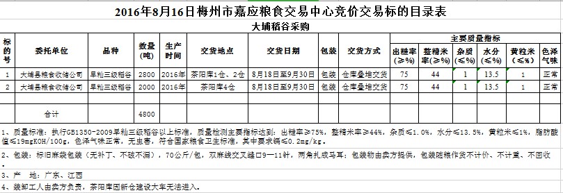 受客戶(hù)委托,梅州市嘉應(yīng)糧食交易中心有限公司定于2016年8月16日舉辦糧食競(jìng)價(jià)交易會(huì),大埔縣糧食收儲(chǔ)公司擬采購(gòu)2016年產(chǎn)早秈三級(jí)稻谷4800噸。