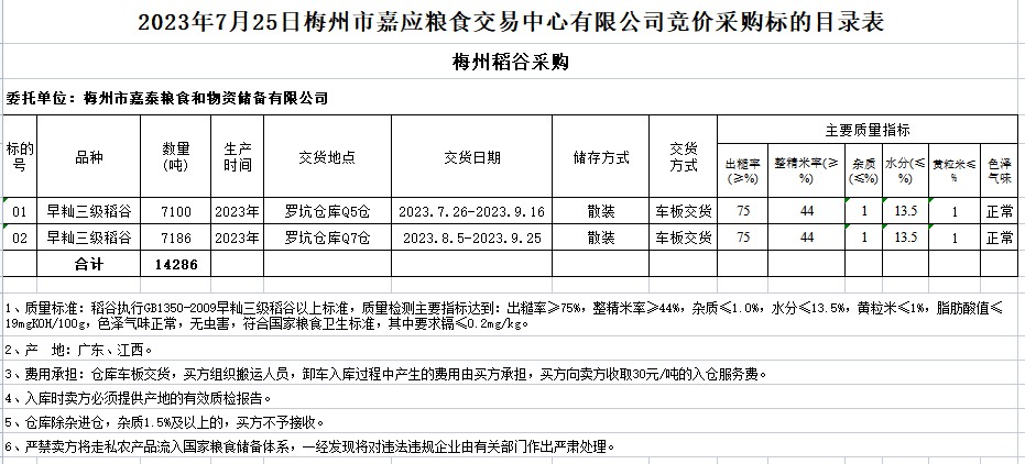 受客戶委托,梅州市嘉應(yīng)糧食交易中心有限公司定于2023年7月25日(星期二)舉辦糧食競(jìng)價(jià)交易會(huì)。梅州市嘉泰糧食和物資儲(chǔ)備有限公司擬采購2023年早秈稻14286噸。