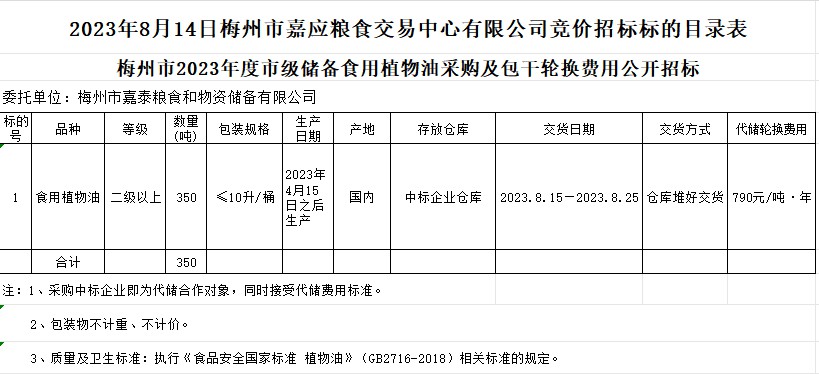 受梅州市嘉泰糧食和物資儲備有限公司委托,梅州市嘉應(yīng)糧食交易中心有限公司定于2023年8月14日(星期一)上午10時15分舉辦梅州市市級儲備食用植物油采購及包干輪換費(fèi)用公開招標(biāo)。