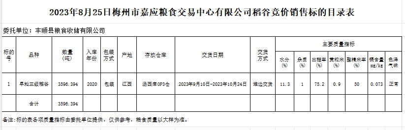 受客戶委托,梅州市嘉應(yīng)糧食交易中心有限公司定于2023年8月25日(星期五)舉辦糧食競價(jià)交易會(huì)。豐順縣糧食收儲(chǔ)有限公司擬銷售2020年早秈稻3596.394噸。