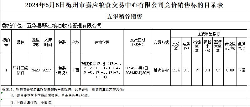 受客戶委托,梅州市嘉應糧食交易中心有限公司定于2024年5月6日(星期一)舉辦糧食競價交易會。五華縣琴江糧油收儲管理有限公司擬銷售2021年產早秈稻3420噸。
