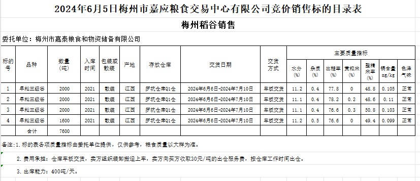 受客戶委托,梅州市嘉應(yīng)糧食交易中心有限公司定于2024年6月5日(星期三)舉辦糧食競價(jià)交易會(huì)。梅州市嘉泰糧食和物資儲(chǔ)備有限公司擬銷售2021年產(chǎn)早秈稻7600噸。