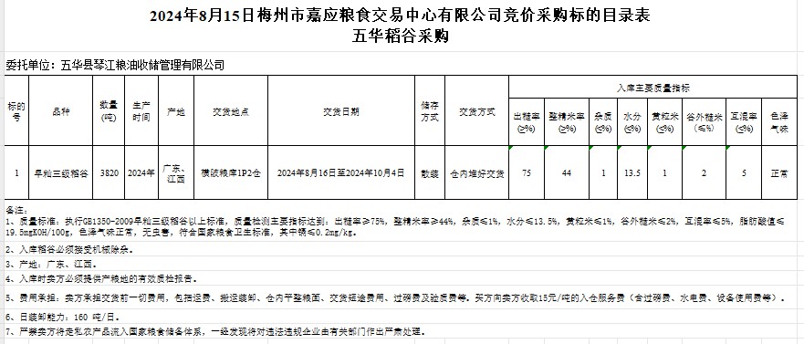 受客戶委托,梅州市嘉應(yīng)糧食交易中心有限公司定于2024年8月15日(星期四)舉辦糧食競價交易會。五華縣琴江糧油收儲管理有限公司擬采購2024年產(chǎn)早秈稻谷3820噸。