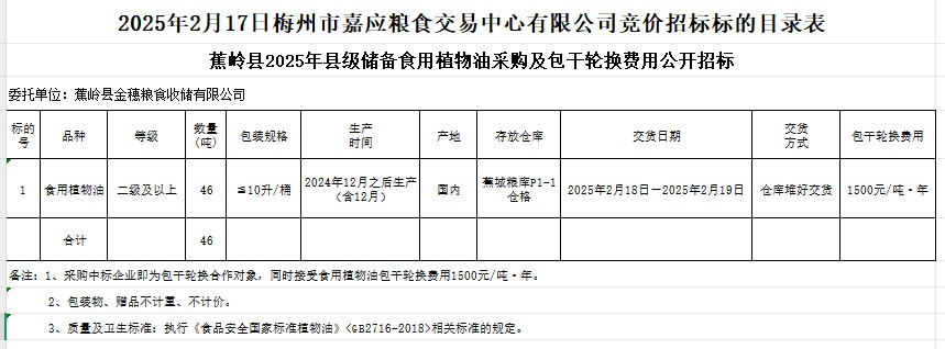 蕉嶺縣2025年縣級(jí)儲(chǔ)備食用植物油采購(gòu)及包干輪換費(fèi)用公開(kāi)招標(biāo)公告