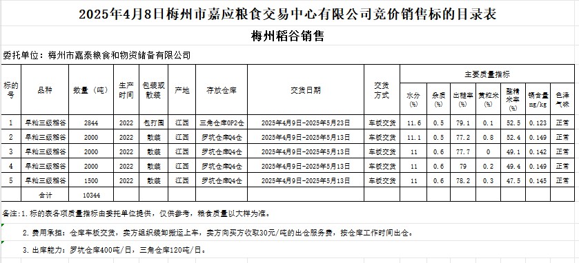 受客戶委托,梅州市嘉應(yīng)糧食交易中心有限公司定于2025年4月8日(星期二)舉辦糧食競(jìng)價(jià)交易會(huì)。梅州市嘉泰糧食和物資儲(chǔ)備有限公司擬銷(xiāo)售2022年產(chǎn)早秈稻谷10344噸。