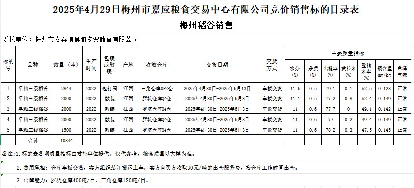 受客戶委托,梅州市嘉應(yīng)糧食交易中心有限公司定于2025年4月29日(星期二)舉辦糧食競價(jià)交易會(huì)。梅州市嘉泰糧食和物資儲(chǔ)備有限公司擬銷售2022年產(chǎn)早秈稻谷10344噸。
