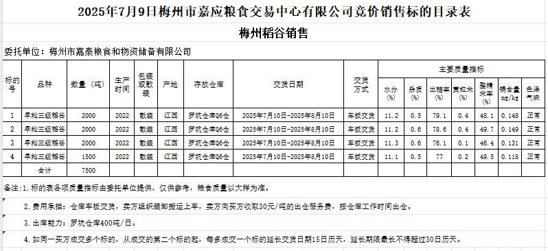 受客戶委托,梅州市嘉應(yīng)糧食交易中心有限公司定于2025年7月9日(星期三)舉辦糧食競價交易會。梅州市嘉泰糧食和物資儲備有限公司擬銷售2022年產(chǎn)早秈稻谷7500噸。