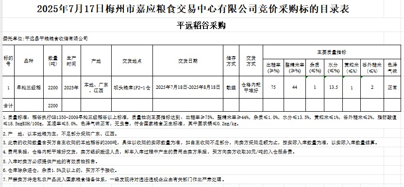 受客戶委托,梅州市嘉應(yīng)糧食交易中心有限公司定于2025年7月17日(星期四)舉辦糧食競價(jià)交易會(huì)。平遠(yuǎn)縣平糧糧食收儲(chǔ)有限公司擬采購2025年產(chǎn)早秈稻谷2200噸。