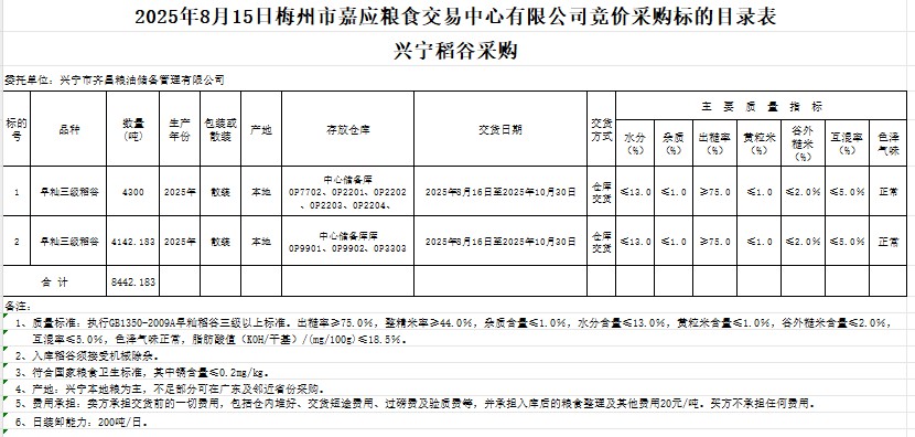 受客戶委托,梅州市嘉應(yīng)糧食交易中心有限公司定于2025年8月15日(星期五)舉辦糧食競價(jià)交易會(huì)。興寧市齊昌糧油儲(chǔ)備管理有限公司擬采購2025年產(chǎn)早秈稻谷8442.183噸。