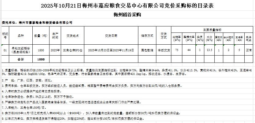 2025年10月21日梅州市嘉泰糧食和物資儲備有限公司稻谷采購