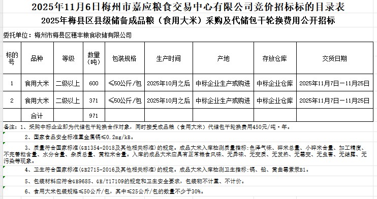 文件下載:2025年11月6日梅縣區(qū)2025年縣級儲備成品糧(食用大米)采購及代儲包干輪換費用公開招標公告
