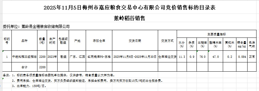 受客戶委托,梅州市嘉應(yīng)糧食交易中心有限公司定于2025年11月5日(星期三)舉辦糧食競價交易會。蕉嶺縣金穗糧食收儲有限公司擬銷售2023年產(chǎn)中晚秈稻谷2200噸。