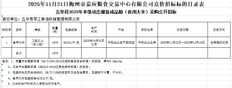 五華縣2025年本級動態(tài)儲備成品糧(食用大米)采購及代儲包干輪換費(fèi)用公開招標(biāo)公告
