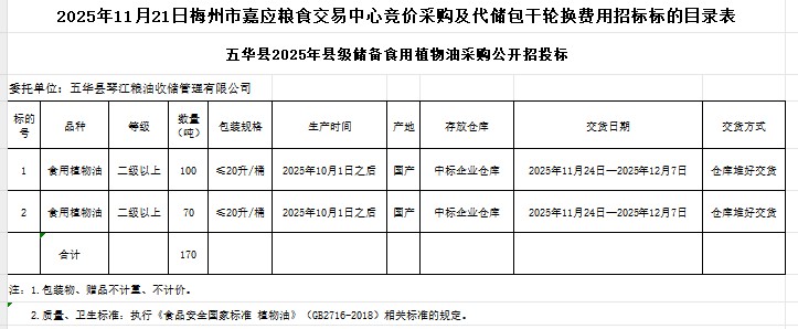 2025年11月21日五華縣2025年縣級(jí)儲(chǔ)備食用植物油采購及代儲(chǔ)包干輪換費(fèi)用公開招標(biāo)公告