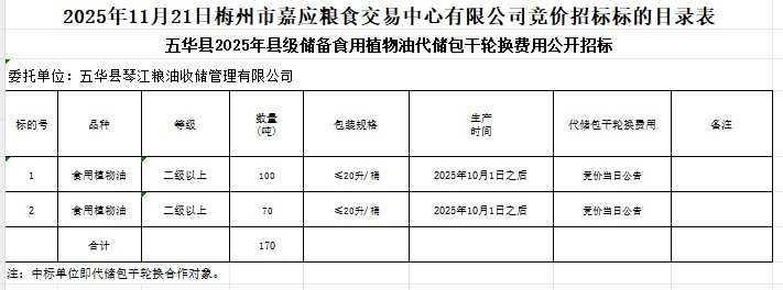 文件下載:2025年11月21日五華縣2025年縣級(jí)儲(chǔ)備食用植物油采購及代儲(chǔ)包干輪換費(fèi)用公開招標(biāo)公告