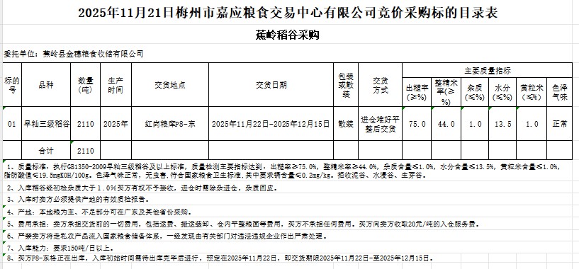 2025年11月21日蕉嶺縣金穗糧食收儲(chǔ)有限公司稻谷采購