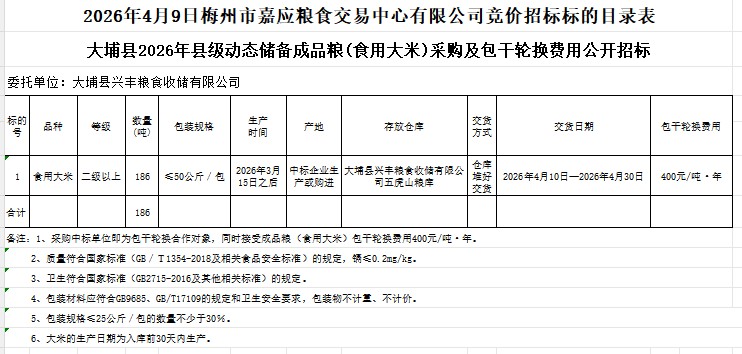 文件下載:2026年4月9日大埔縣2026年縣級(jí)動(dòng)態(tài)儲(chǔ)備成品糧(食用大米)采購及包干輪換費(fèi)用公開招標(biāo)公告