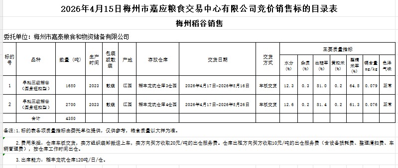 受客戶委托,梅州市嘉應(yīng)糧食交易中心有限公司定于2026年4月15日(星期三)舉辦糧食競價交易會。梅州市嘉泰糧食和物資儲備有限公司擬銷售2023年產(chǎn)早秈稻谷(圓身短粒型)4350噸。